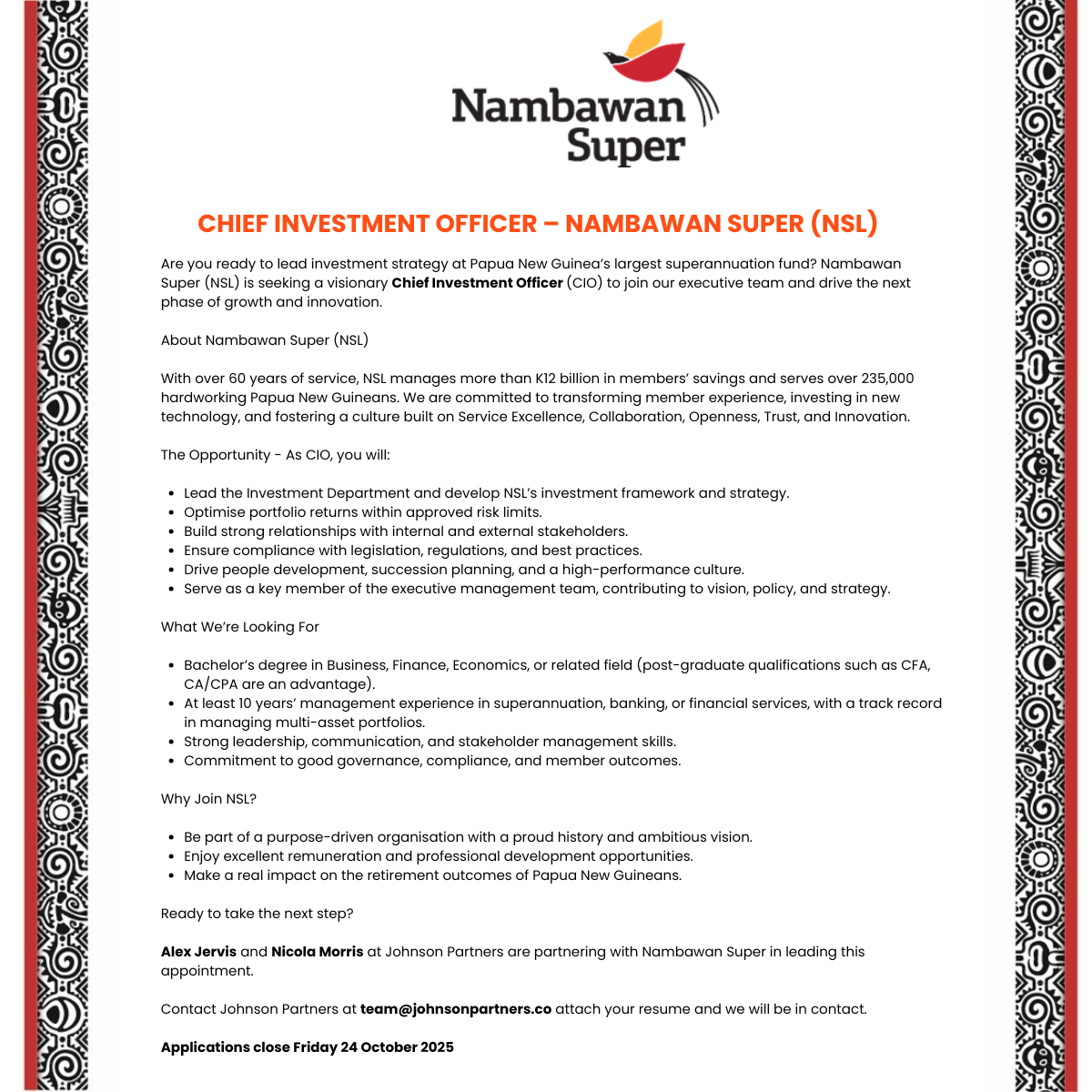 Are you ready to lead investment strategy at Papua New Guinea's largest superannuation fund? Nambawan Super Ltd (NSL) is seeking a visionary Chief Investment Officer (CIO) to join our executive team and drive the next phase of growth and innovation.